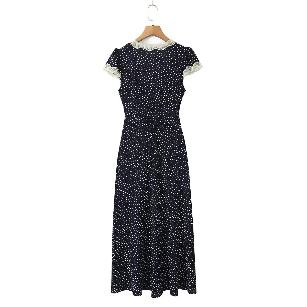 فستان نسائي طويل منقط باللون الأزرق الداكن موديل 2025، مزين بالدانتيل، وفتحة رقبة على شكل حرف V، وأكمام قصيرة، وقصة على شكل حرف A