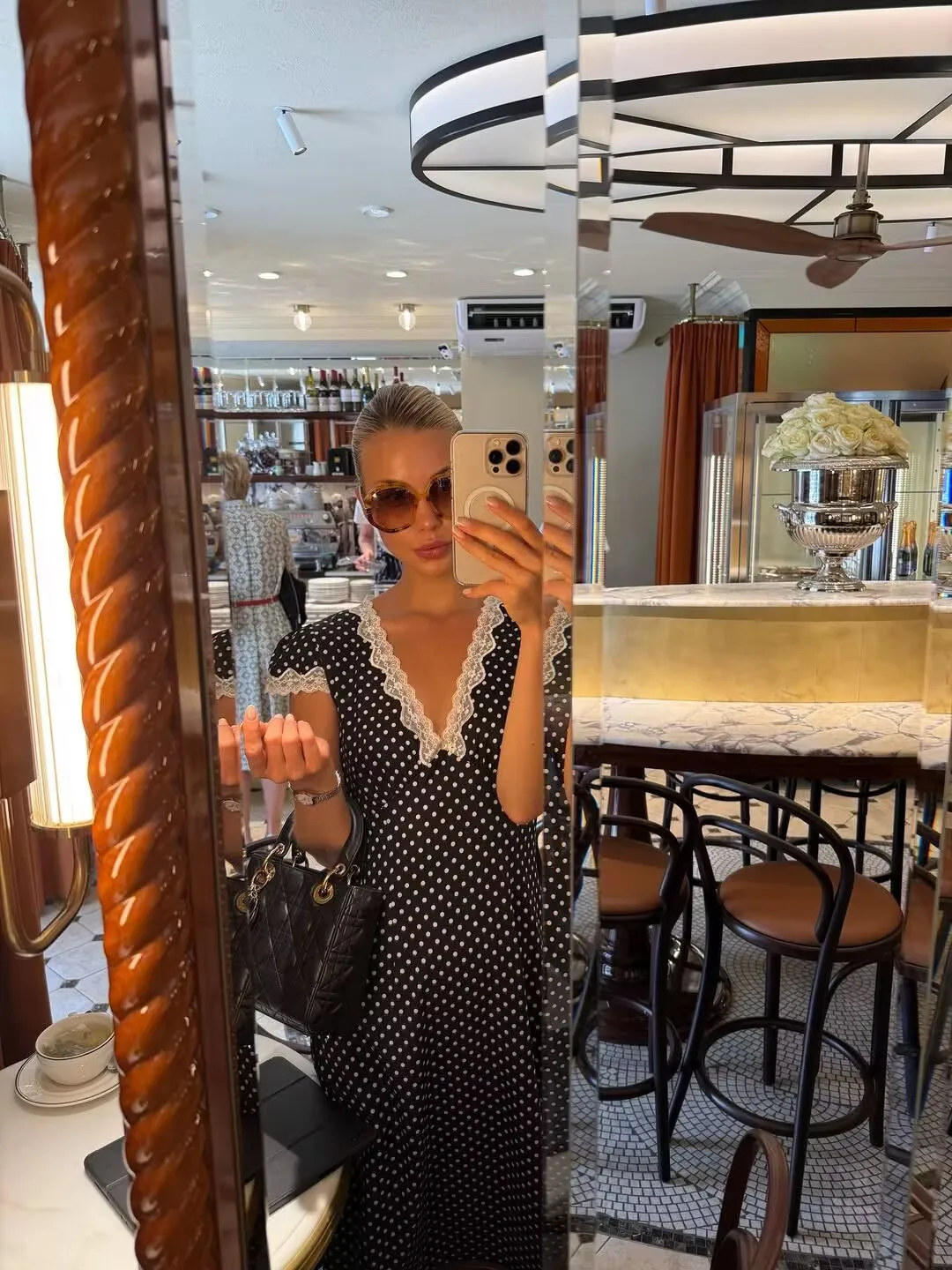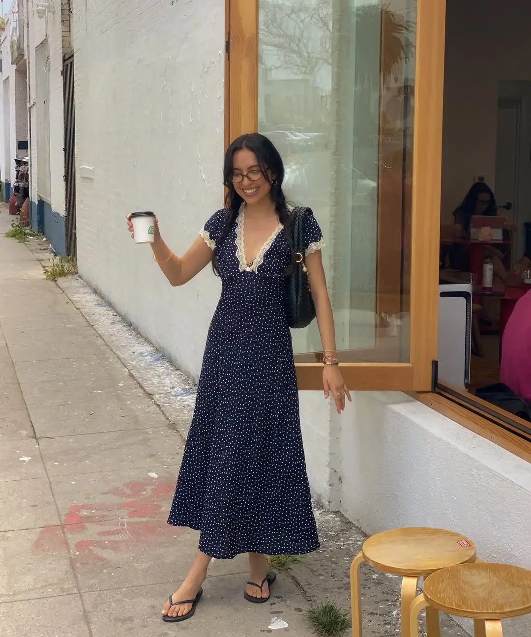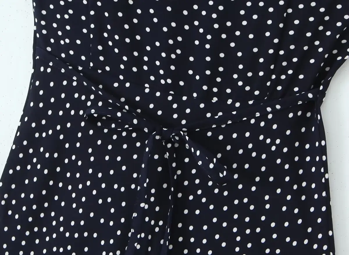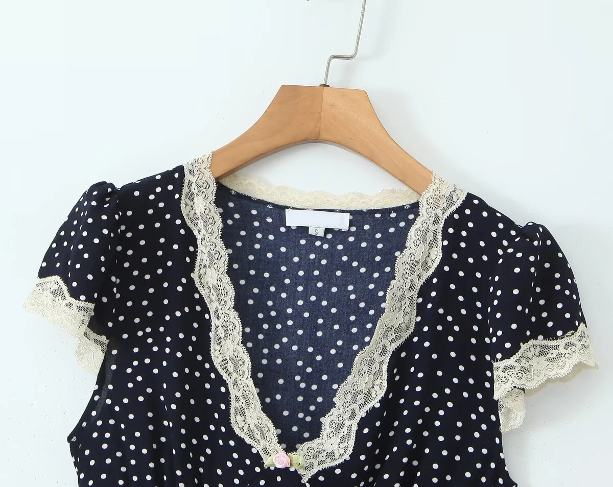 فستان صيفي أنيق مزخرف بنقاط اليوكا، بياقة V مع دانتيل وأكمام قصير، مثالي للعطلات.