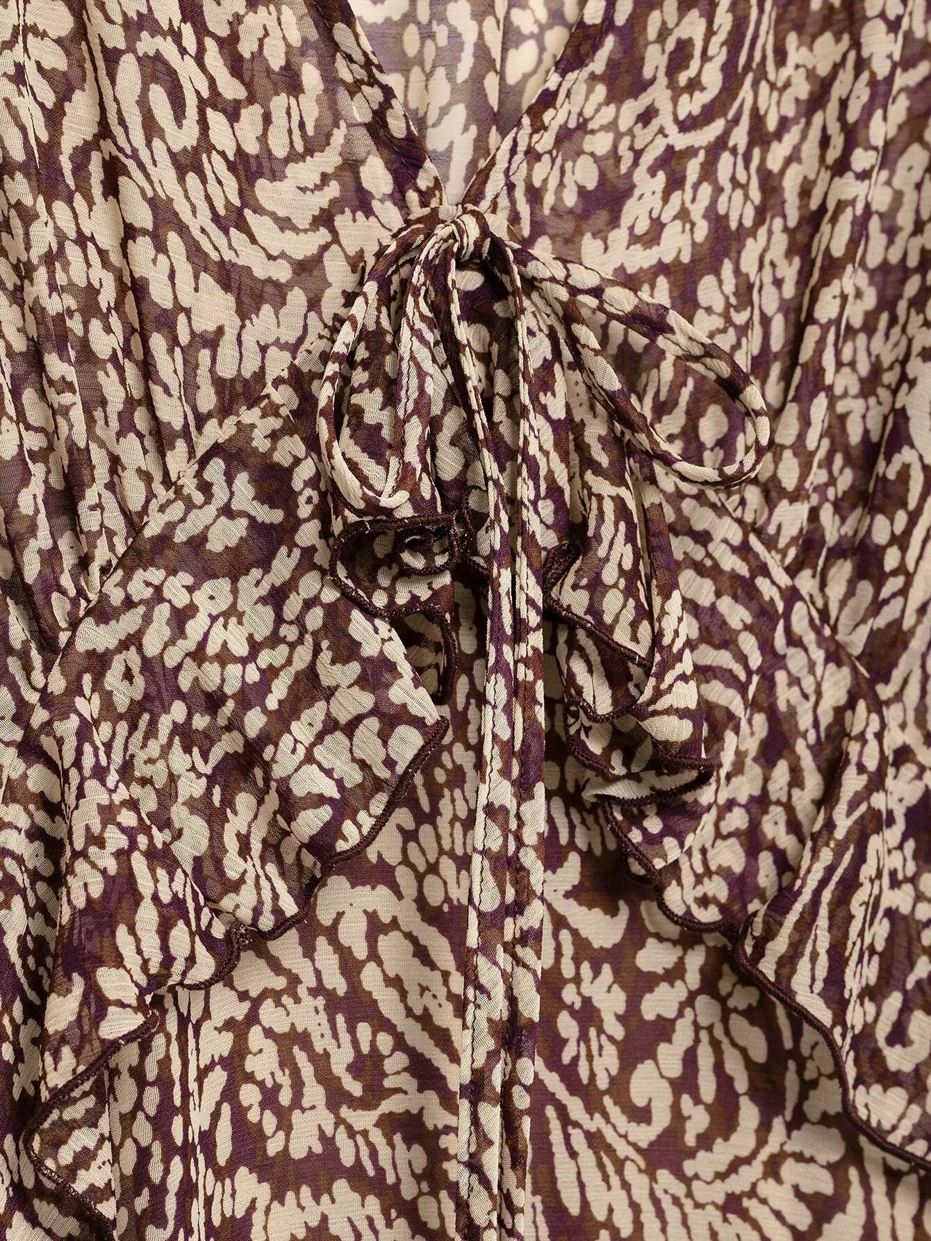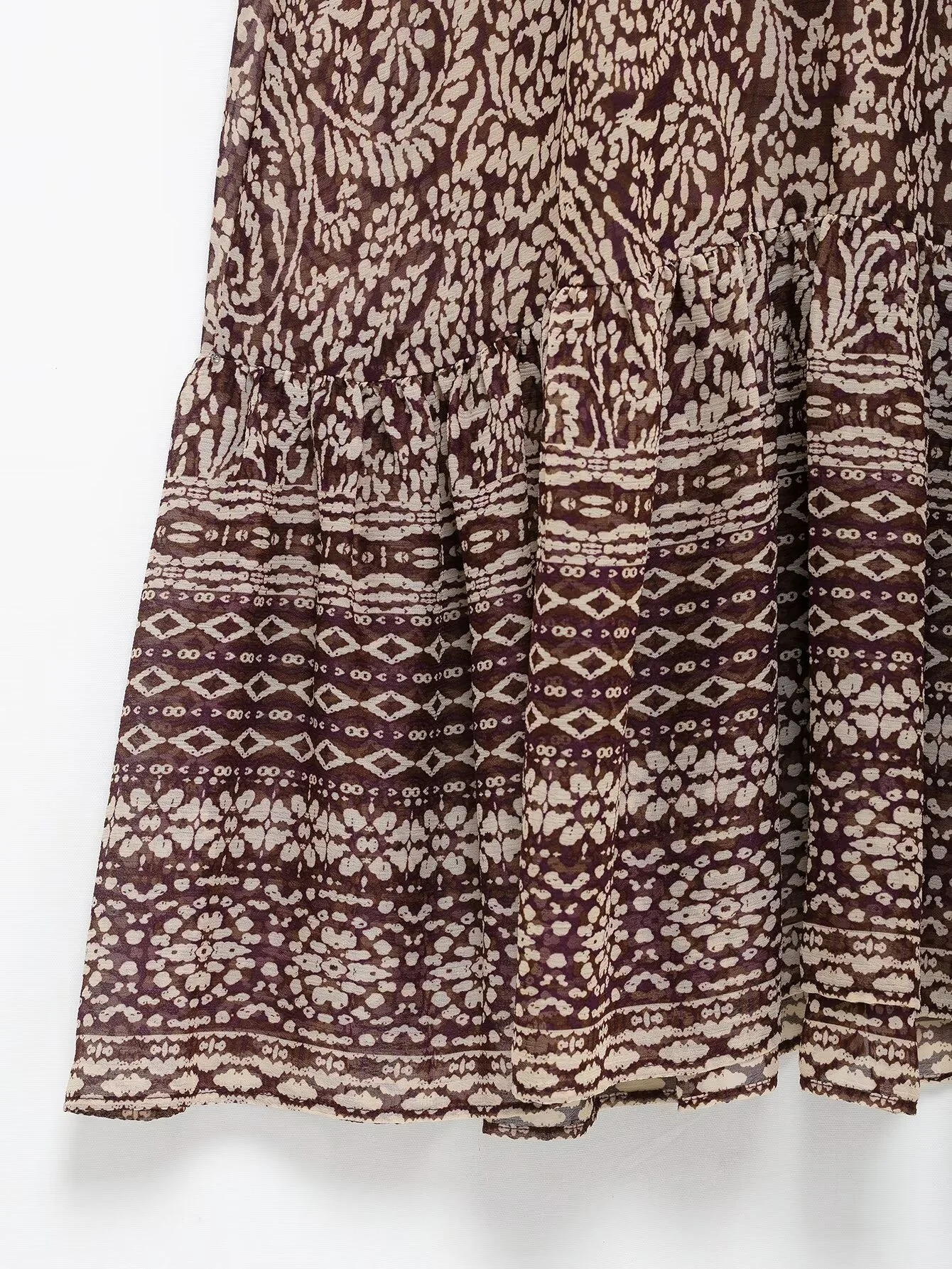 فستان متوسطي بنقشة ريترو، بياقة V وتصميم متدرج أنيق، مثالي للربيع.