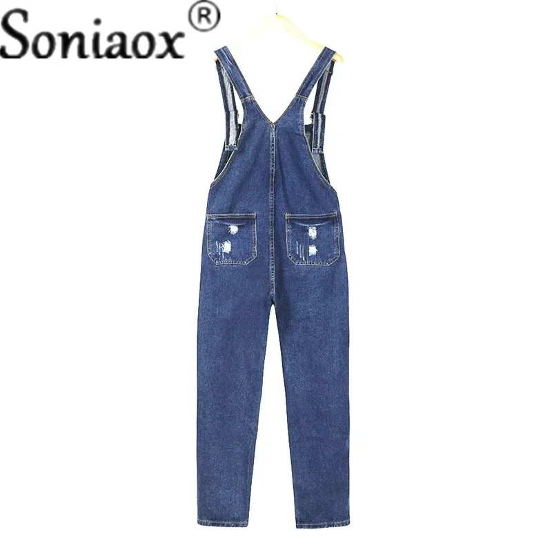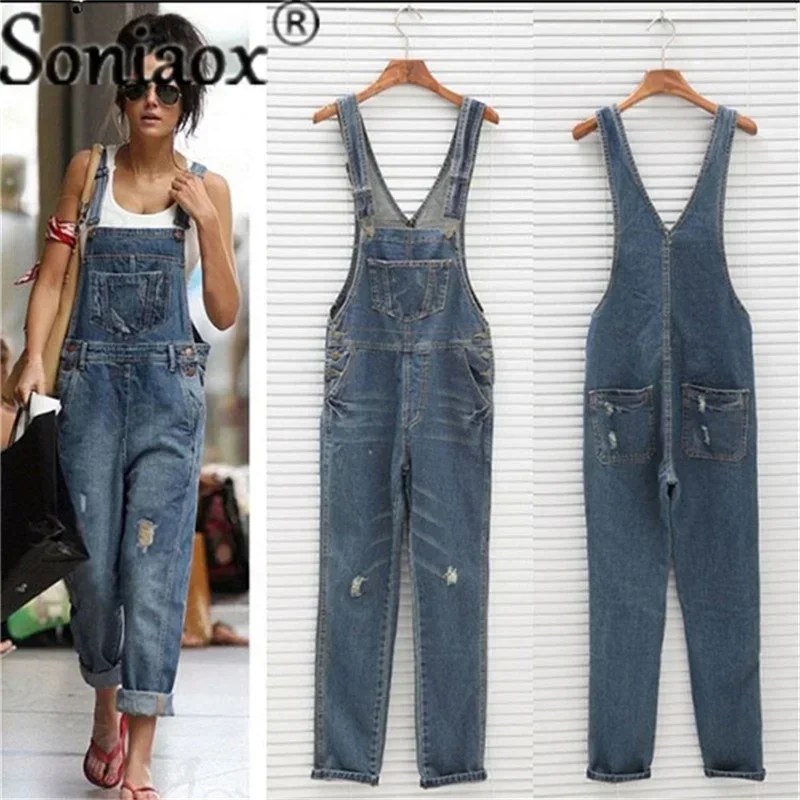 جمبسوت جينز كاجوال للنساء من Streetwear Hole Denim Jumpsuits 2024 بحمالات فضفاضة وجيوب وبنطال طويل مع خصر مستقيم ورومبير جينز