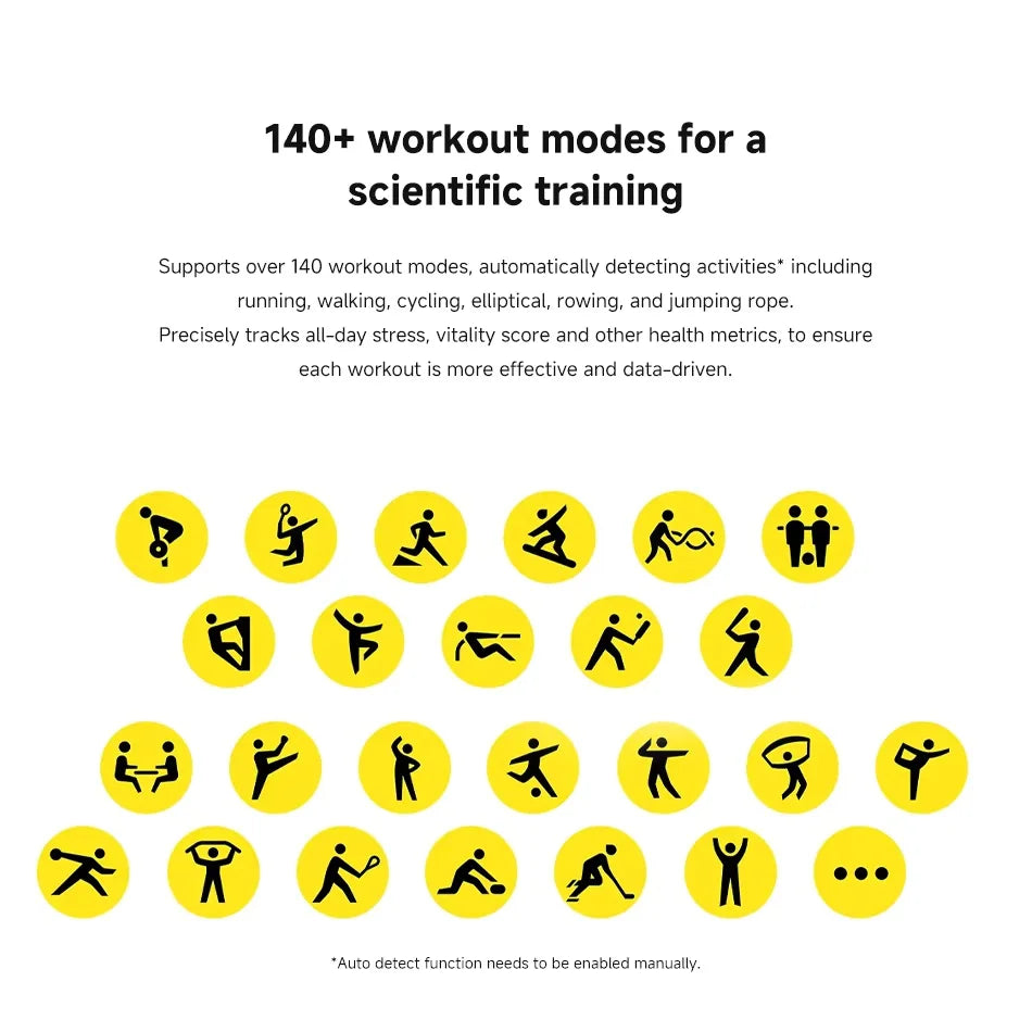 *تم اختبار عمر البطارية لمدة 12 يومًا عند الاستخدام الكثيف باستخدام الساعة: مشحونة بالكامل؛ باستخدام إعدادات المصنع الافتراضية وقرص ثابت؛ تشغيل مراقبة النوم عالية الدقة ومراقبة جودة التنفس أثناء النوم؛ تشغيل اكتشاف معدل ضربات القلب وإشعارات الرسائل (200 رسالة و4 مكالمات و4 إنذارات يوميًا) كل 11 دقيقة يوميًا؛ رفع المعصم لتشغيل الشاشة 200 مرة في اليوم؛ بدء تشغيل التطبيق يدويًا لمزامنة البيانات مرتين في اليوم؛ 30 دقيقة من مكالمات البلوتوث كل أسبوع؛ واستخدامه لتسجيل التمارين لمدة 150 دقيقة كل أسبوع.