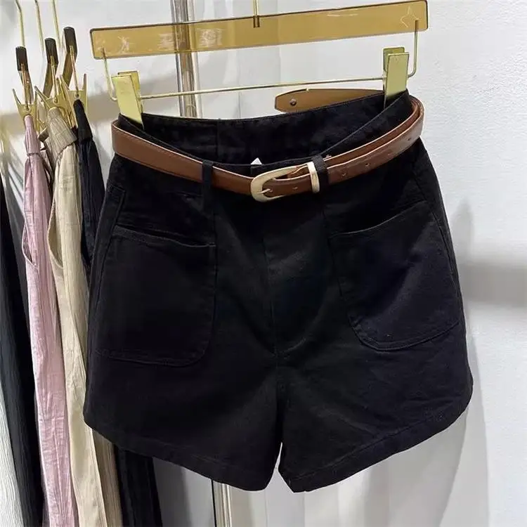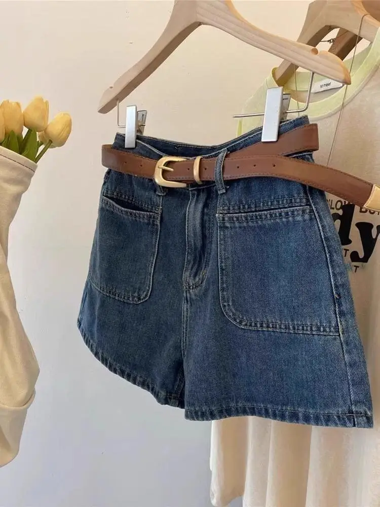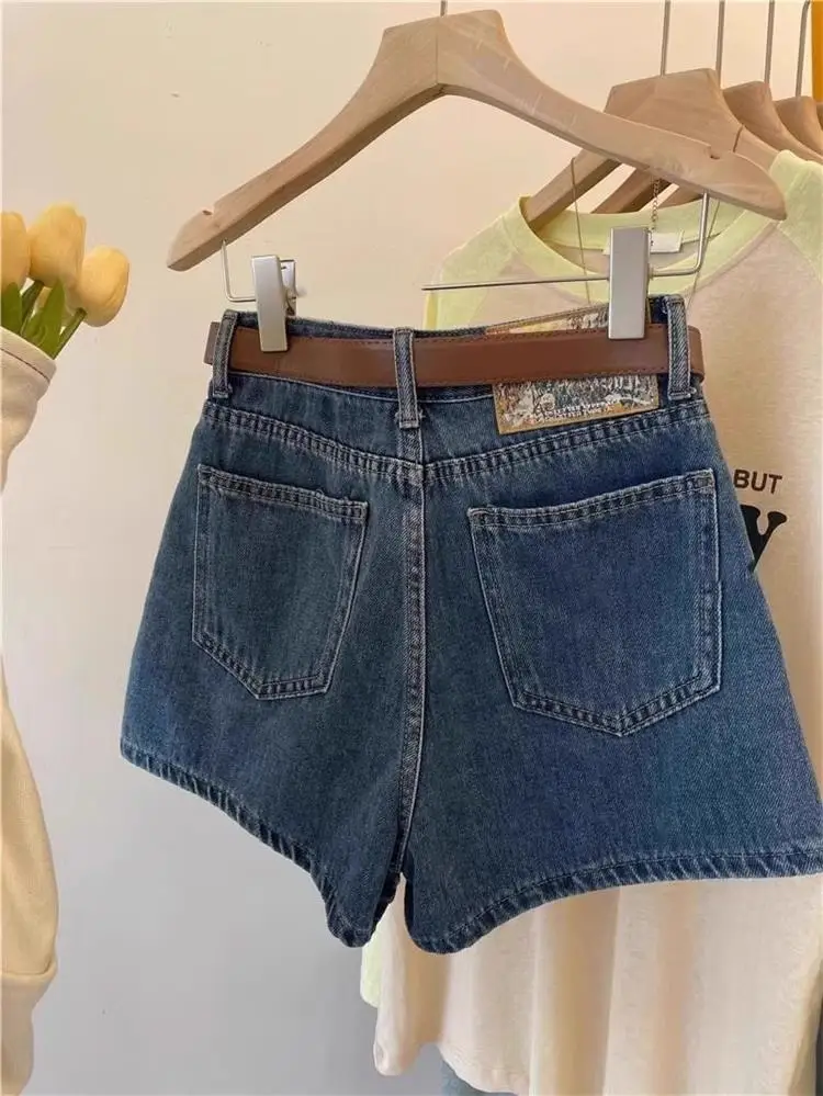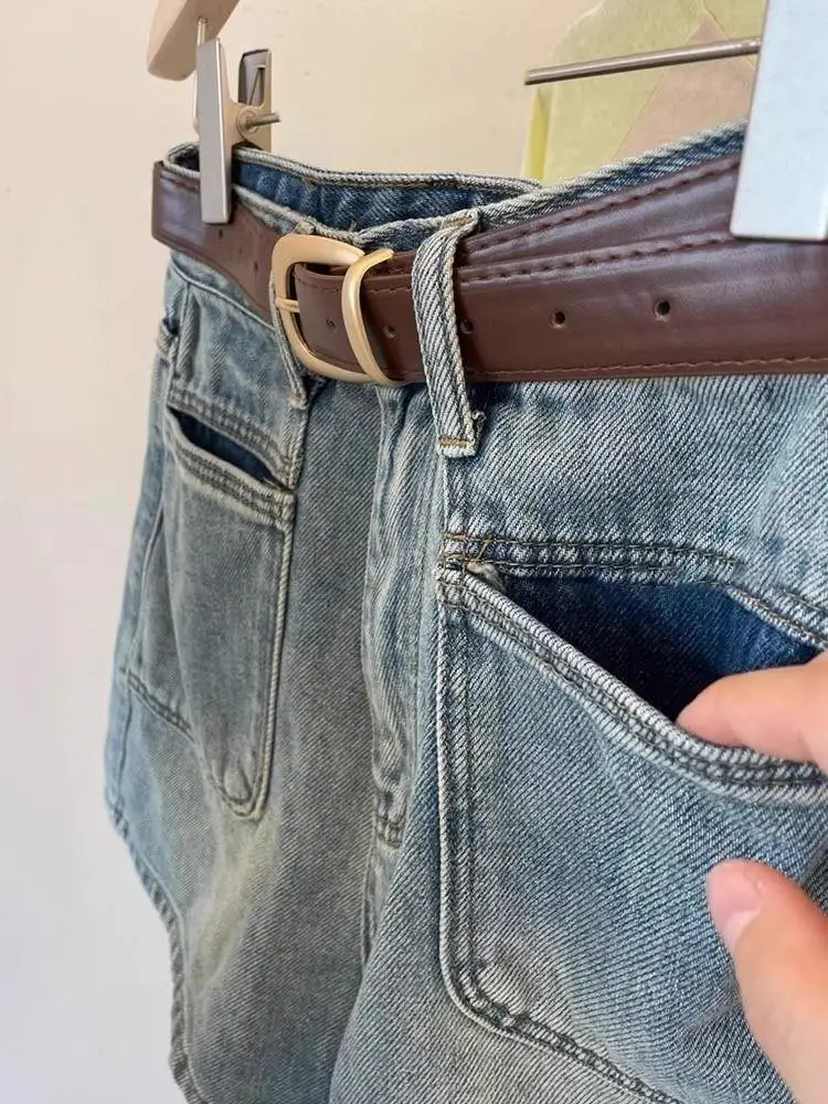 بنطلون جينز نسائي صيفي بخصر عالٍ وواسع الساق باللون الأزرق بتصميم عتيق على شكل كمثرى لتنحيف الجسم على شكل حرف A مقاس كبير