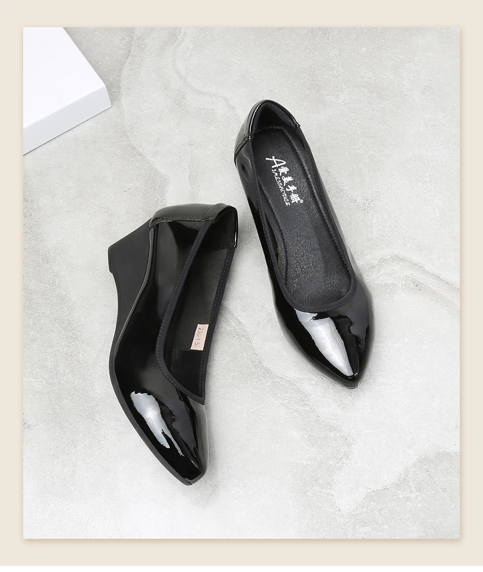 حذاء نسائي مثير ذو مقدمة مدببة من الجلد اللامع بكعب 2025 حذاء موكاسين نسائي أنيق بكعب إسفيني سهل الارتداء من لوليتا 33